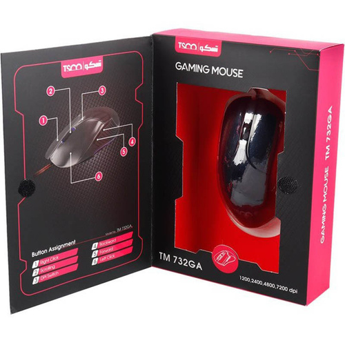 ماوس گیمینگ تسکو مدل TM 732GA یک ماوس خوش ساخت، با بدنه ای مناسب برای مانورهای سریع و راحت است. این ماوس می تواند گزینه مناسبی باشد تا به خواسته خود در بازی دست یابید. این محصول فوق العاده زیبا با طراحی خاص و با کیفیت دارای 6 عدد کلید است که به منظور ارتقای کیفیت کار و افزایش سرعت عمل در بازی تعبیه شده است. این ماوس دارای اتصال با سیم به طول 1.8 متر و رابط پورت USB است و برای لپ تاپ، کامپیوتر و سایر دستگاه های دارای درگاه USB مناسب است. این محصول باکیفیت به حسگر نوری مجهز شده و دقت حسگری بین 1200-2400-4800-7200DPI دارد که به واسطه دکمه تنظیم حسگر نیز می توان آن را کنترل کرد.