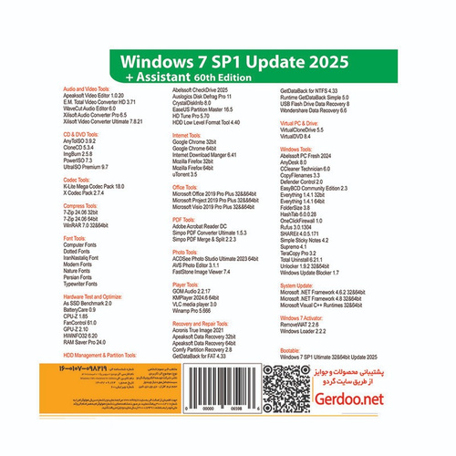 این محصول شامل آخرین نسخه از ویندوز 7 سرویس پک 1 آپدیت 2025 گردو در ویرایشهای 32 و 64 بیتی با اتوران اختصاصی گردو به همراه راهنمای نصب فارسی است. همچنین در این محصول، مجموعهای بینظیر از نرم افزارها و ابزارهای عمومی و کاربردی مناسب کاربران مبتدی و حرفهای قرار داده شده است.